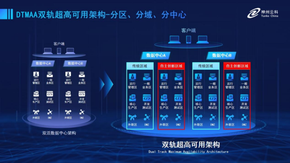 为帮助金融客户更好地应对数字经济时代对可持续性的高要求,实现“信创”与“数字化”齐头并进,WM视讯平台 WM推出了双轨超高可用架构。该架构在双活数据中心的分区调度基础上,增加信创域和非信创域的分域调度,实行信创域与传统域应用全量部署,使双中心运营变为双中心四区域并行运行,互为多活,将“0到1”的单轨建设道路变为分区分域协同的多活双轨超高可用架构。帮助客户在新架构下,保障“信创”的同时解决性能瓶颈,提升稳定性,保证应用可持续性,最终实现信创区域和非信创区域的平滑过渡,完成国产化替代目标。